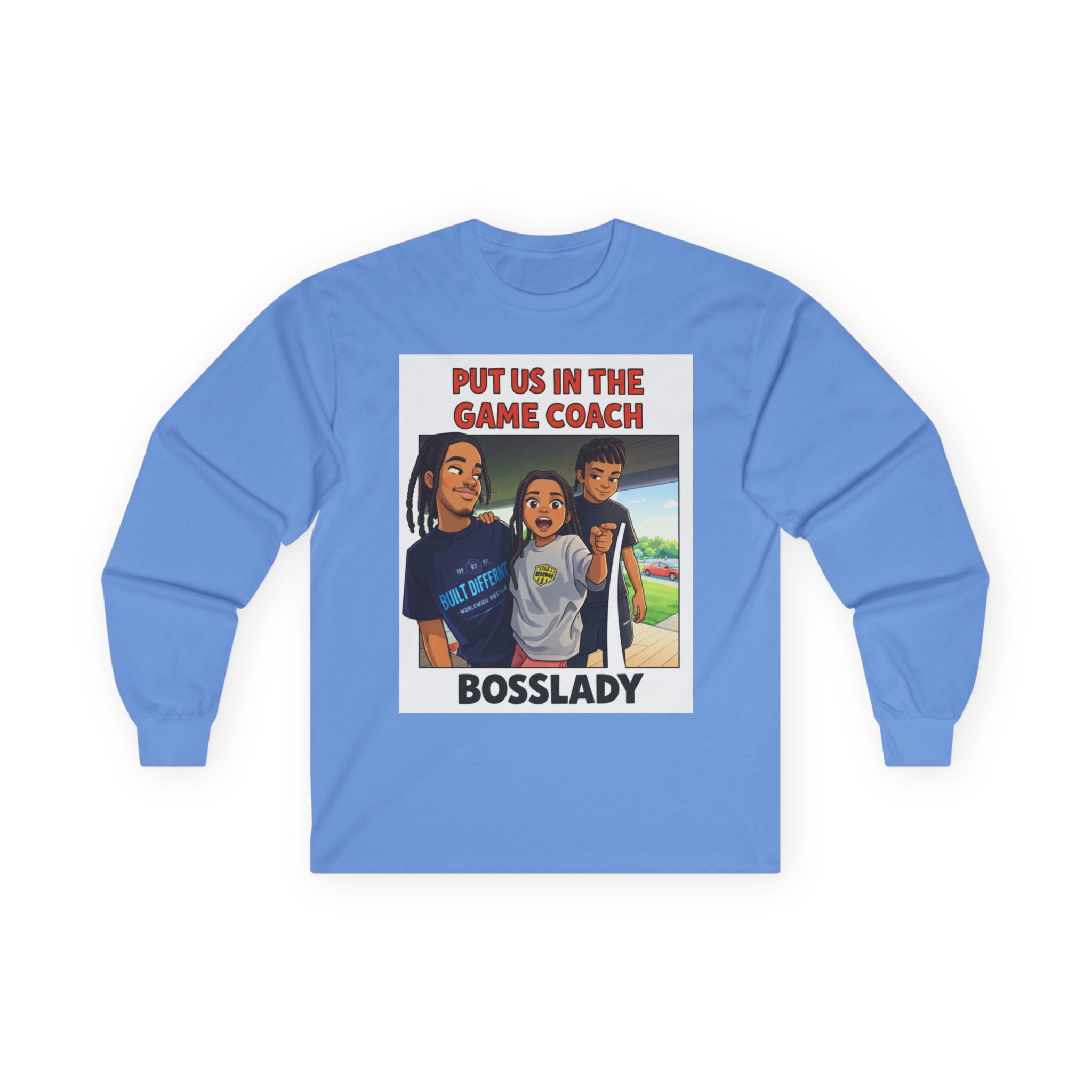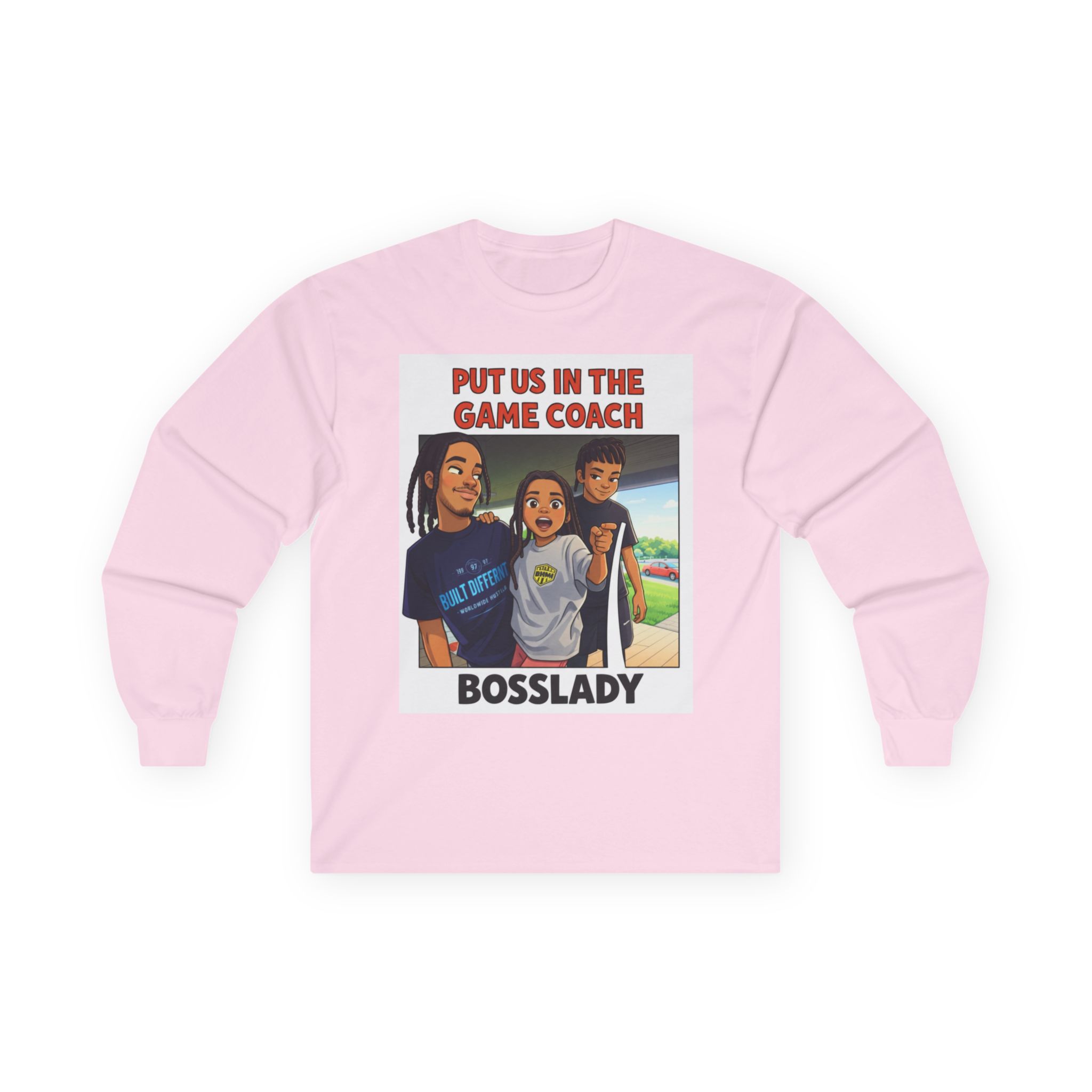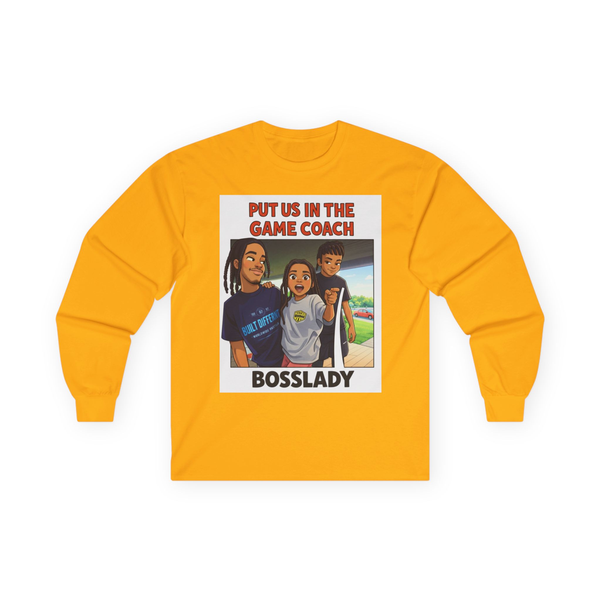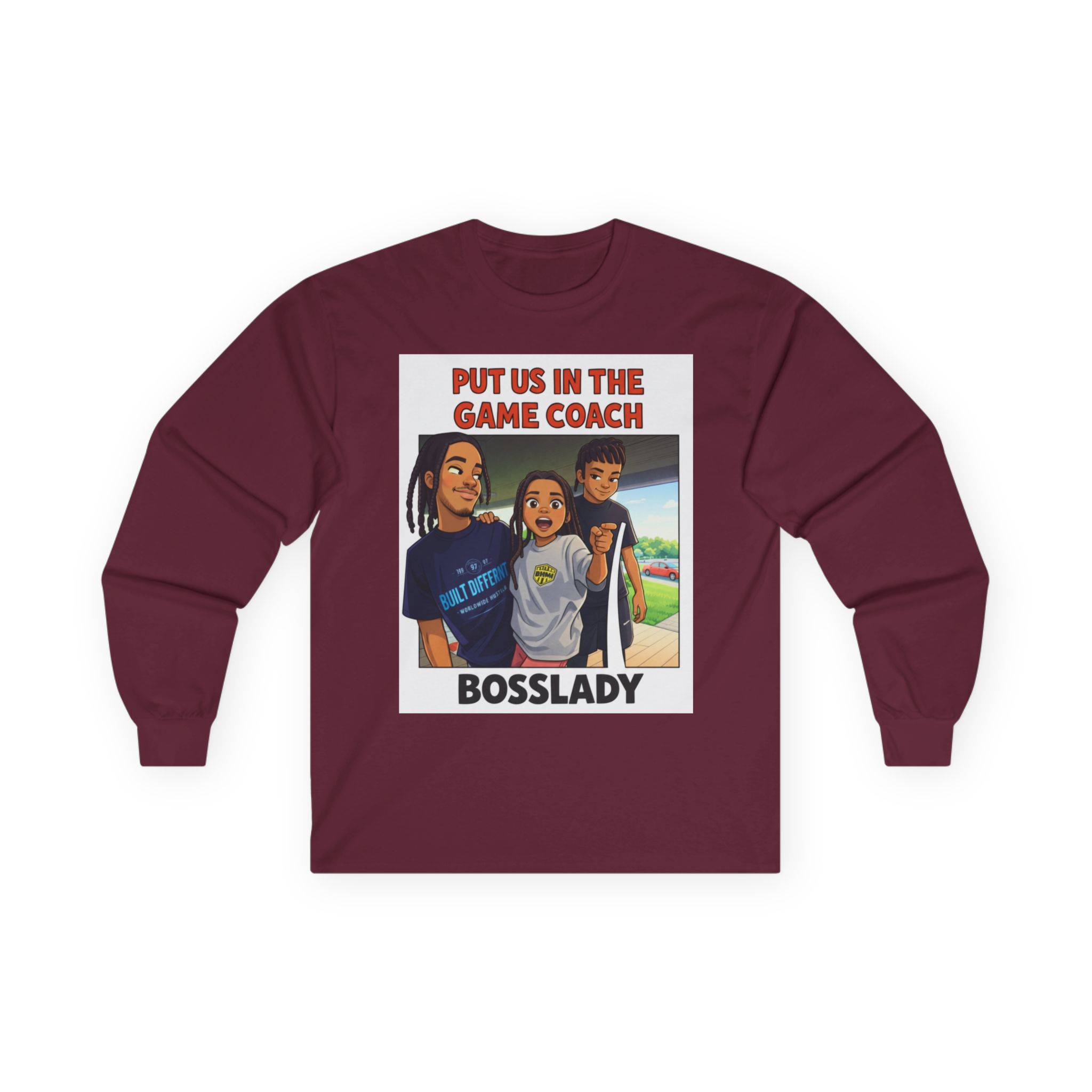 This long-sleeve tee carries a quiet, confident energy ,soft vintage-weight cotton with a bold, illustrated front that celebrates leadership and community. The artwork shows three determined figures framed by an open-field backdrop and the words “PUT US IN THE GAME COACH / BOSSLADY,” turning a casual shirt into a statement about stepping up, mentoring, and showing up for your team. Wear it to practices, weekend hangouts, or low-key rallies where you want to be seen, not shouted at. The medium-weight fabric, ribbed collar, and tubular knit construction give a structured, lived-in look that holds shape while still feeling broken-in. Sized for an adult classic fit, this piece layers easily under jackets or over hoodies and becomes a favorite for seasons when you want warmth without bulk.