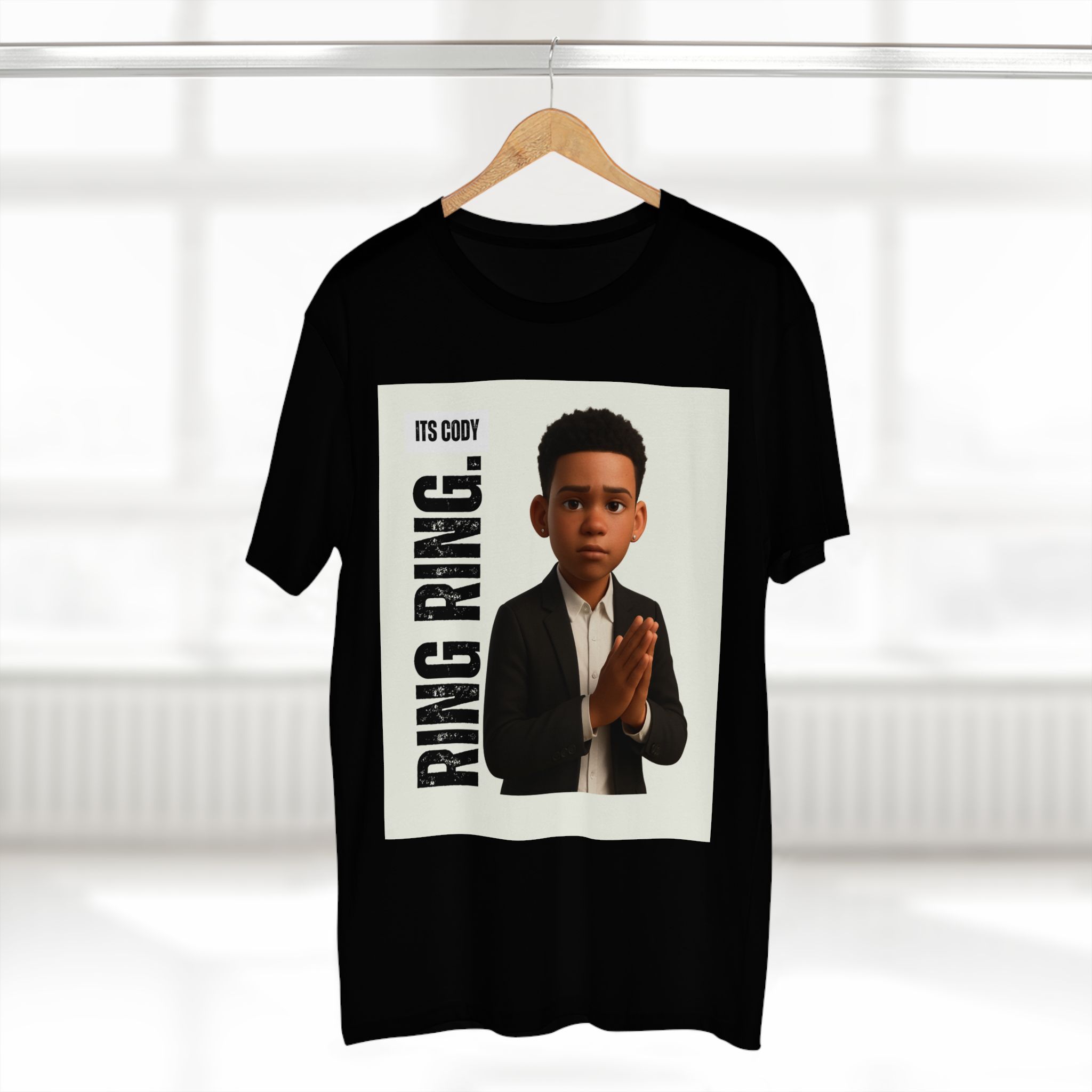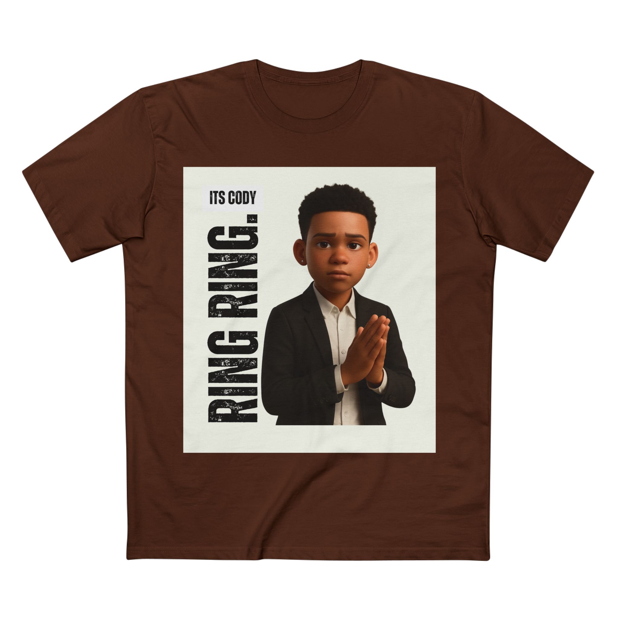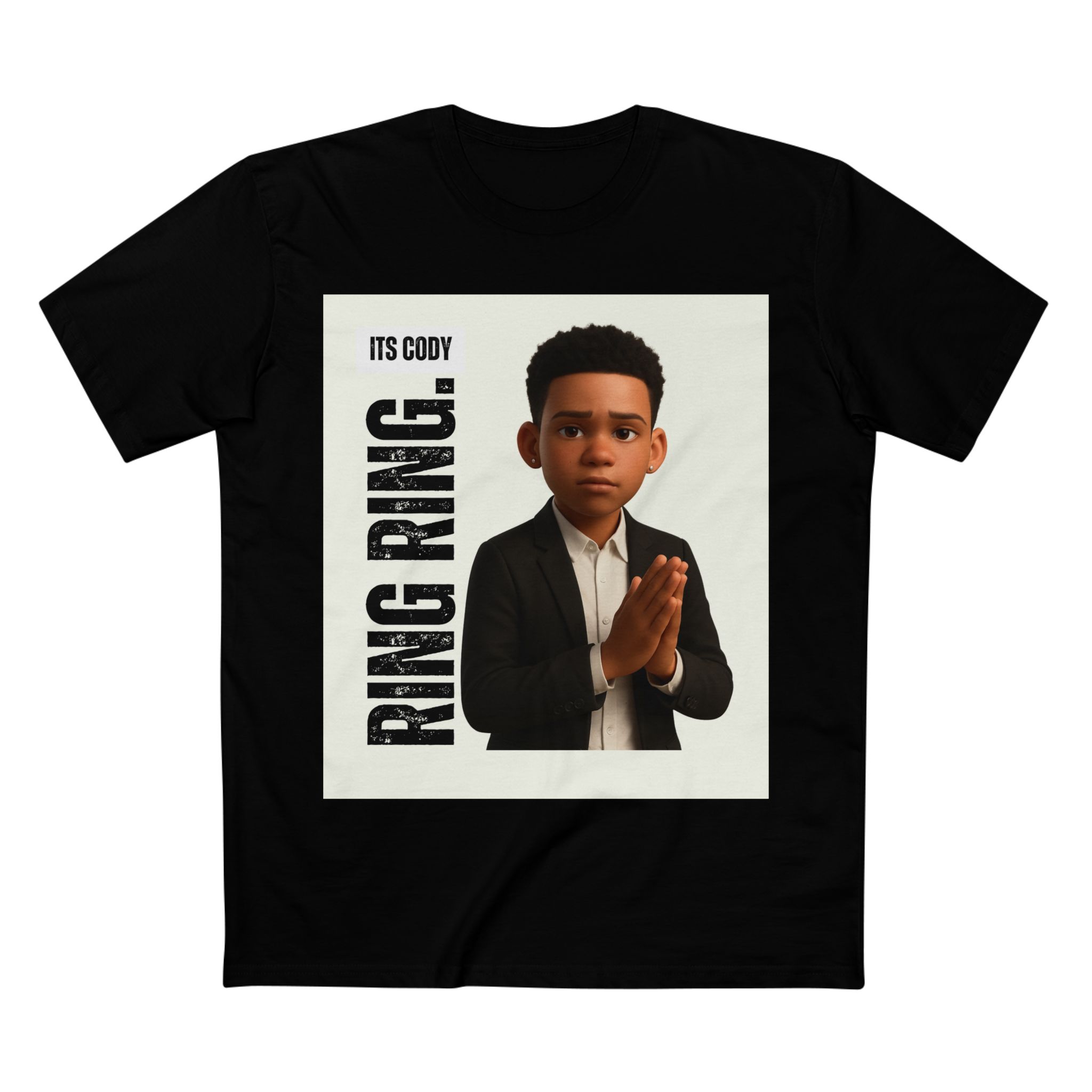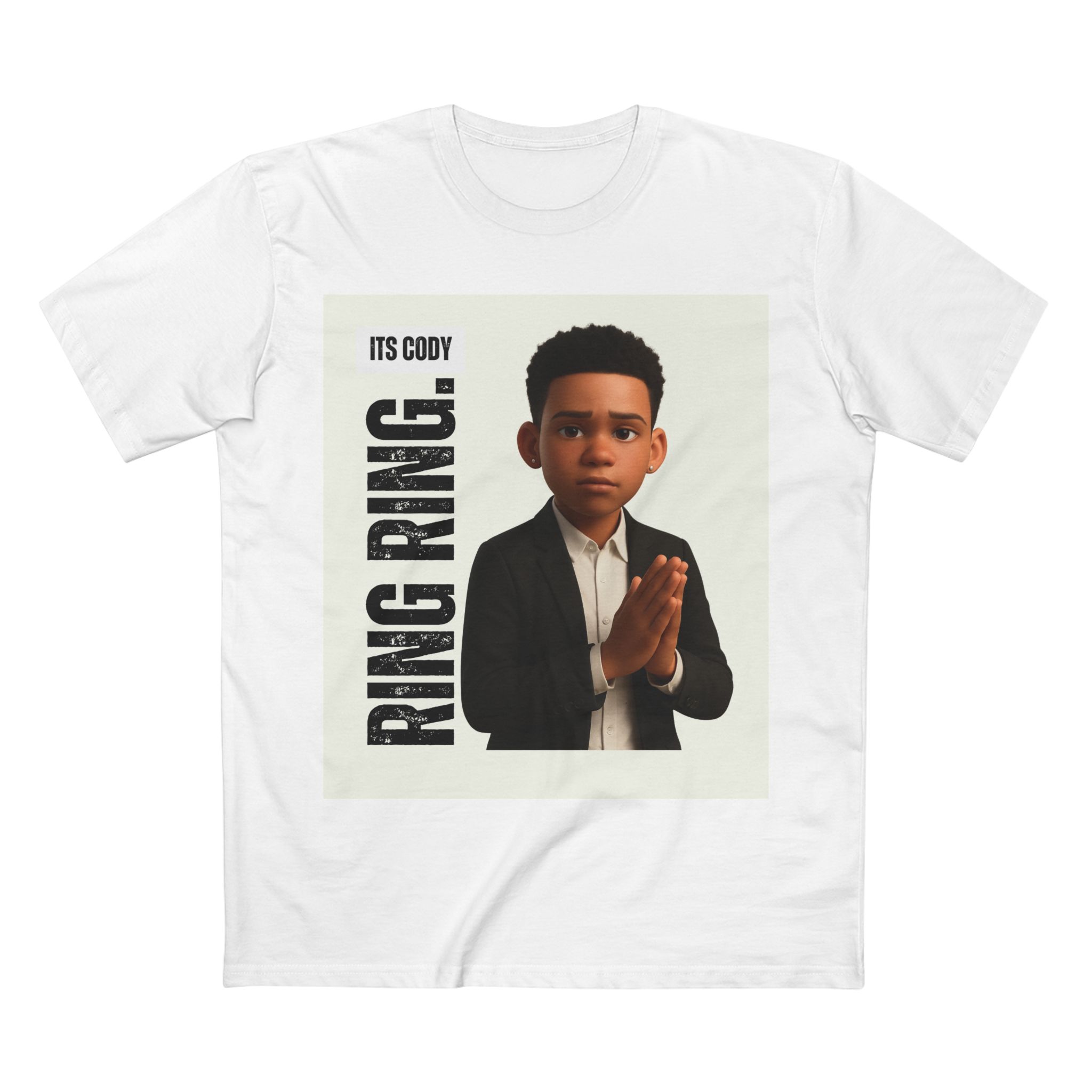 A soft, everyday tee that carries a quiet, playful attitude. The front features a bold portrait-style print of a thoughtful young man in a suit with hands together, framed by the vertical type: “RING RING.” The image reads like a still from a short, clever story equal parts earnest and wry so the shirt feels like wearing an inside joke or a nod to someone who moves through life with quiet confidence. Lightweight but structured, it layers easily under jackets or stands alone with jeans. It’s the kind of shirt you reach for when you want to say something without saying a lot: a subtle statement piece for casual days, meetups, or nights out when you want to keep the vibe low-key but memorable.
