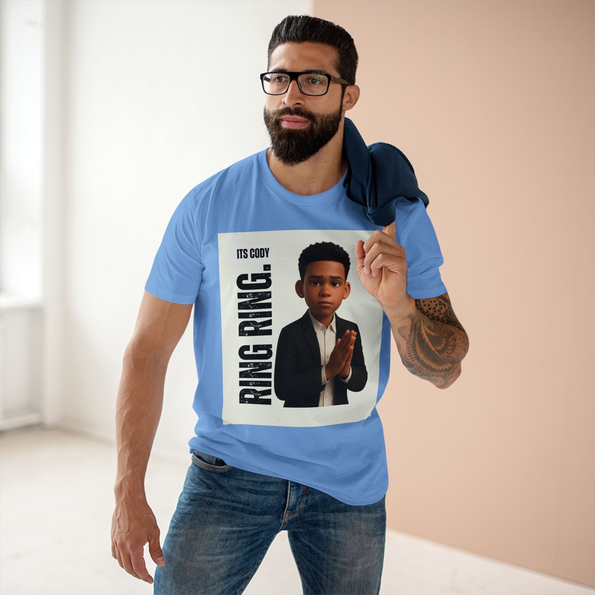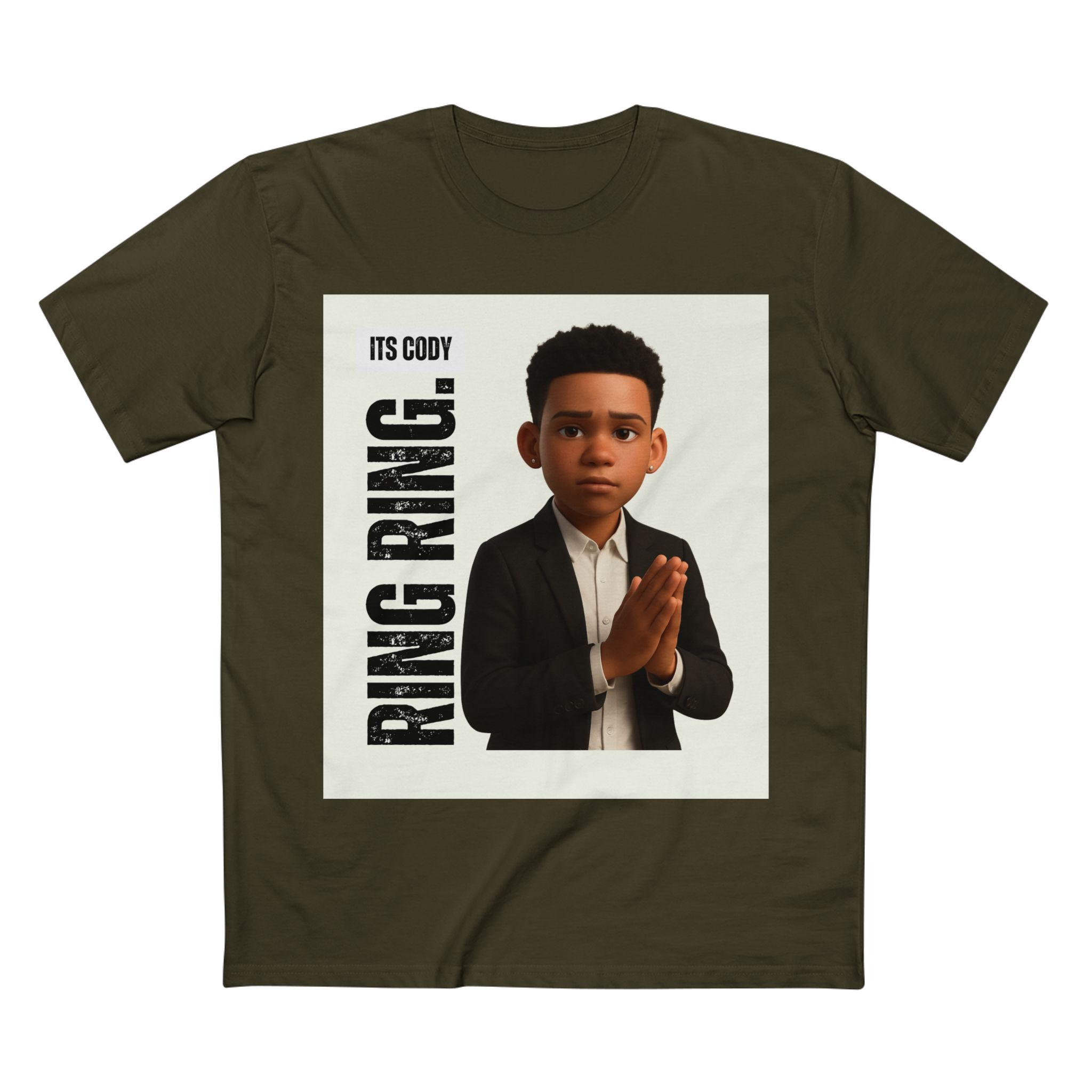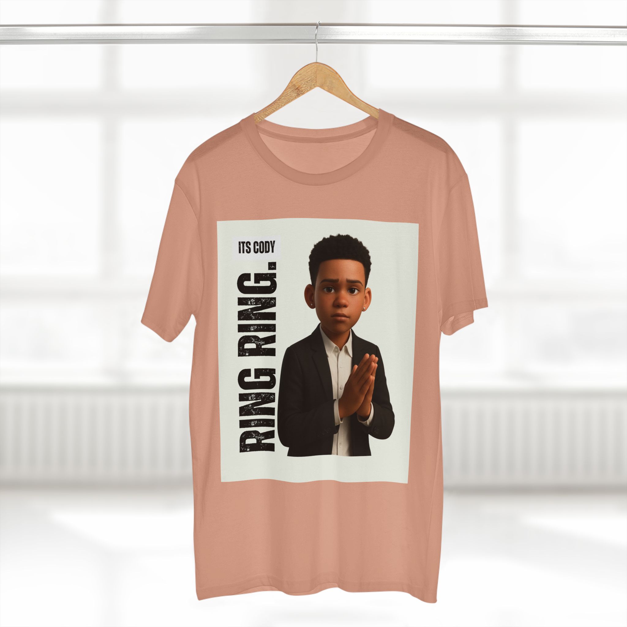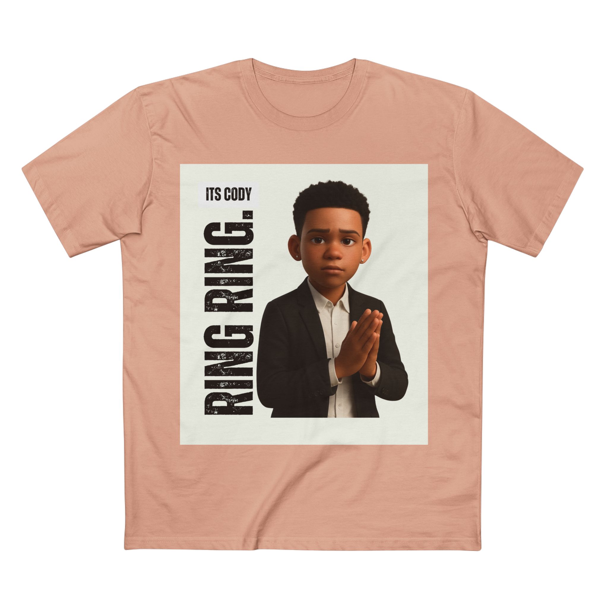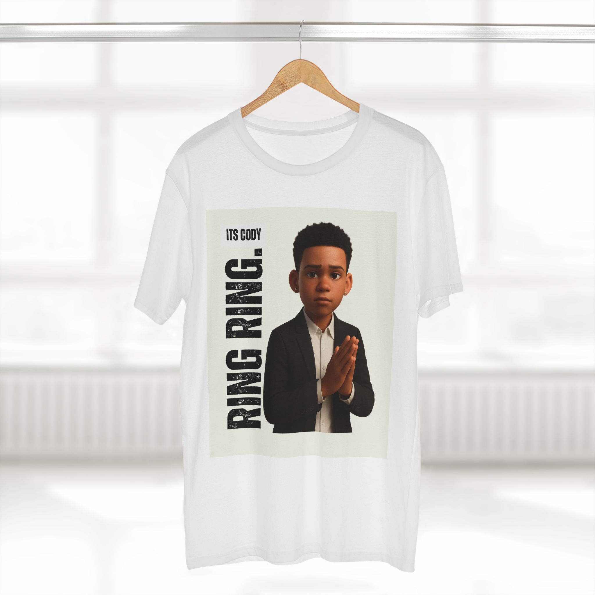 A soft, everyday tee that carries a quiet, playful attitude. The front features a bold portrait-style print of a thoughtful young man in a suit with hands together, framed by the vertical type: “RING RING.” The image reads like a still from a short, clever story equal parts earnest and wry so the shirt feels like wearing an inside joke or a nod to someone who moves through life with quiet confidence. Lightweight but structured, it layers easily under jackets or stands alone with jeans. It’s the kind of shirt you reach for when you want to say something without saying a lot: a subtle statement piece for casual days, meetups, or nights out when you want to keep the vibe low-key but memorable.