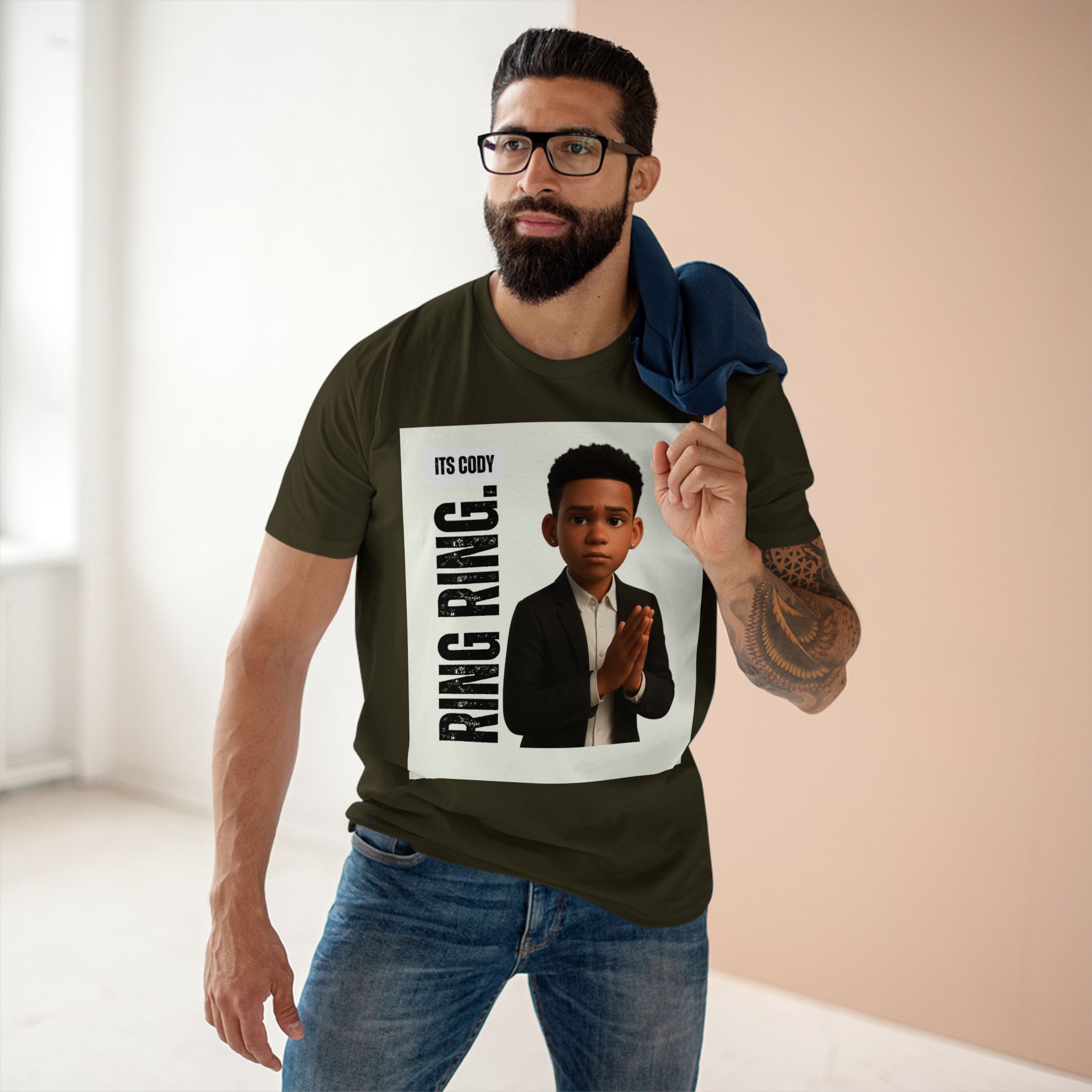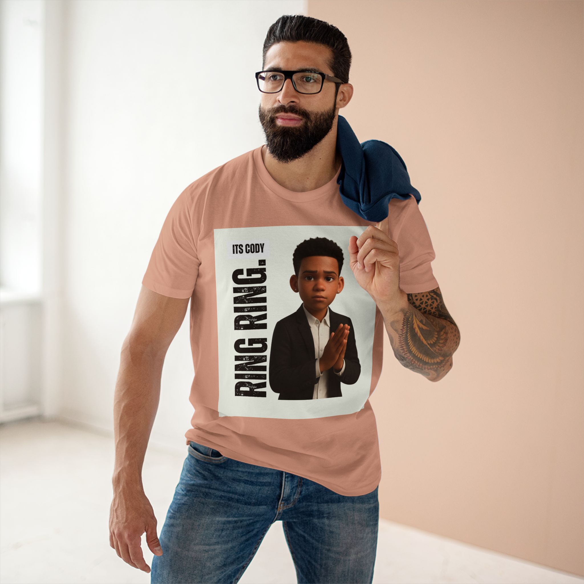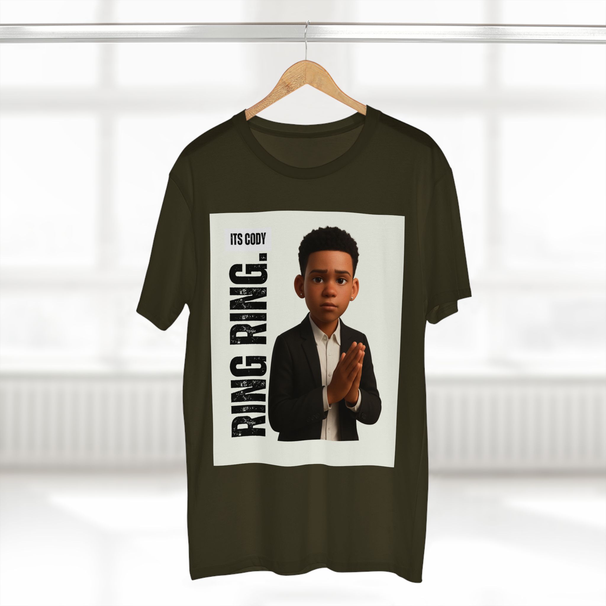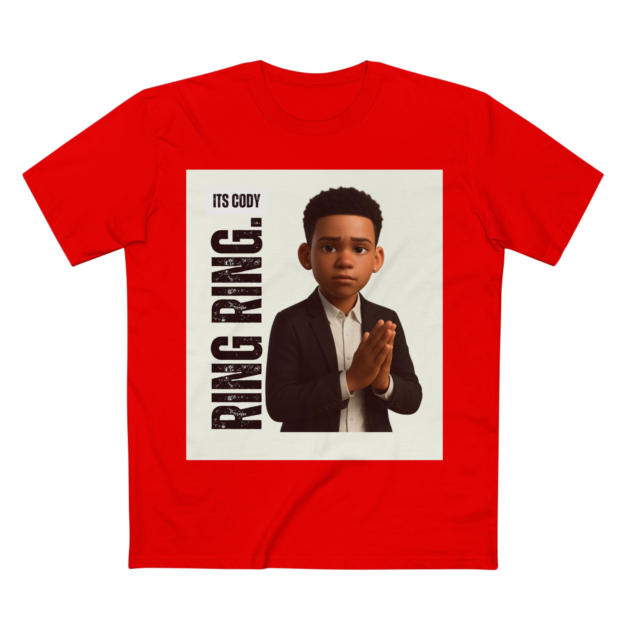 A soft, everyday tee that carries a quiet, playful attitude. The front features a bold portrait-style print of a thoughtful young man in a suit with hands together, framed by the vertical type: “RING RING.” The image reads like a still from a short, clever story equal parts earnest and wry so the shirt feels like wearing an inside joke or a nod to someone who moves through life with quiet confidence. Lightweight but structured, it layers easily under jackets or stands alone with jeans. It’s the kind of shirt you reach for when you want to say something without saying a lot: a subtle statement piece for casual days, meetups, or nights out when you want to keep the vibe low-key but memorable.
